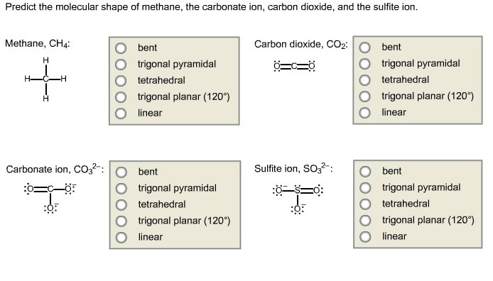 What is the molecular shape of the sulfite ion? Molecular shape of sulfite ion test; The lewis structures of methane, the carbonate ion, carbon dioxide, and the sulfite ion are given methane, ch carbonate ion, co carbon dioxide, co, sulfite ion, o: