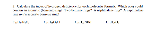 Index of hydrogen deficiency is pretty easy to calculate if you know the equation to use. (a) aspirin, c9h8o4 (b) ascorbic acid (vitamin c), c6h8o6 (c) pyridine, c5h5n (d) urea, ch4n2o (e) cholesterol, c27h46o (f) dopamine, c8h11no2. So the basic in the rules well, the basic equation is to in and n is the number of carbons you have in the compound close to minus the number of hard regions.